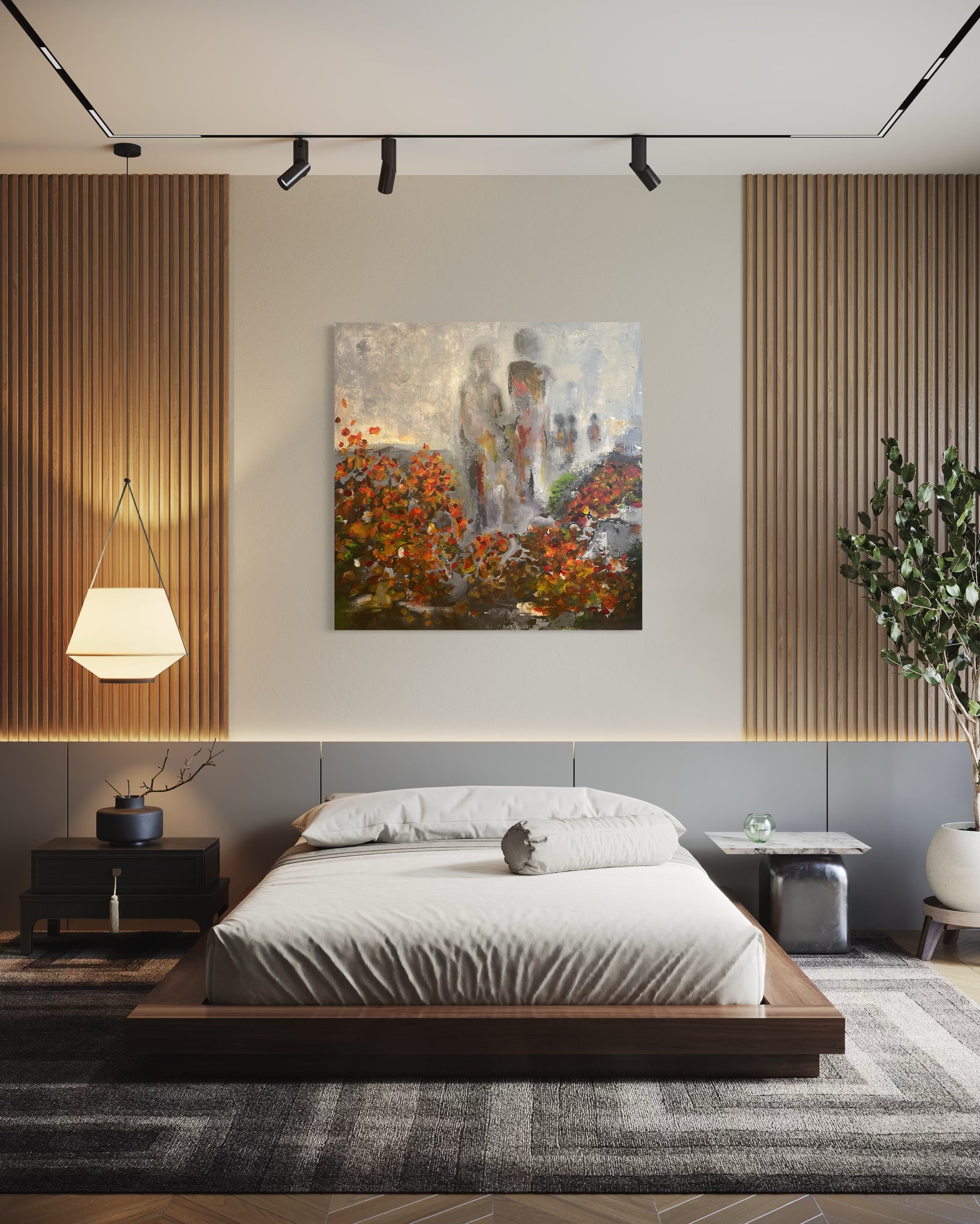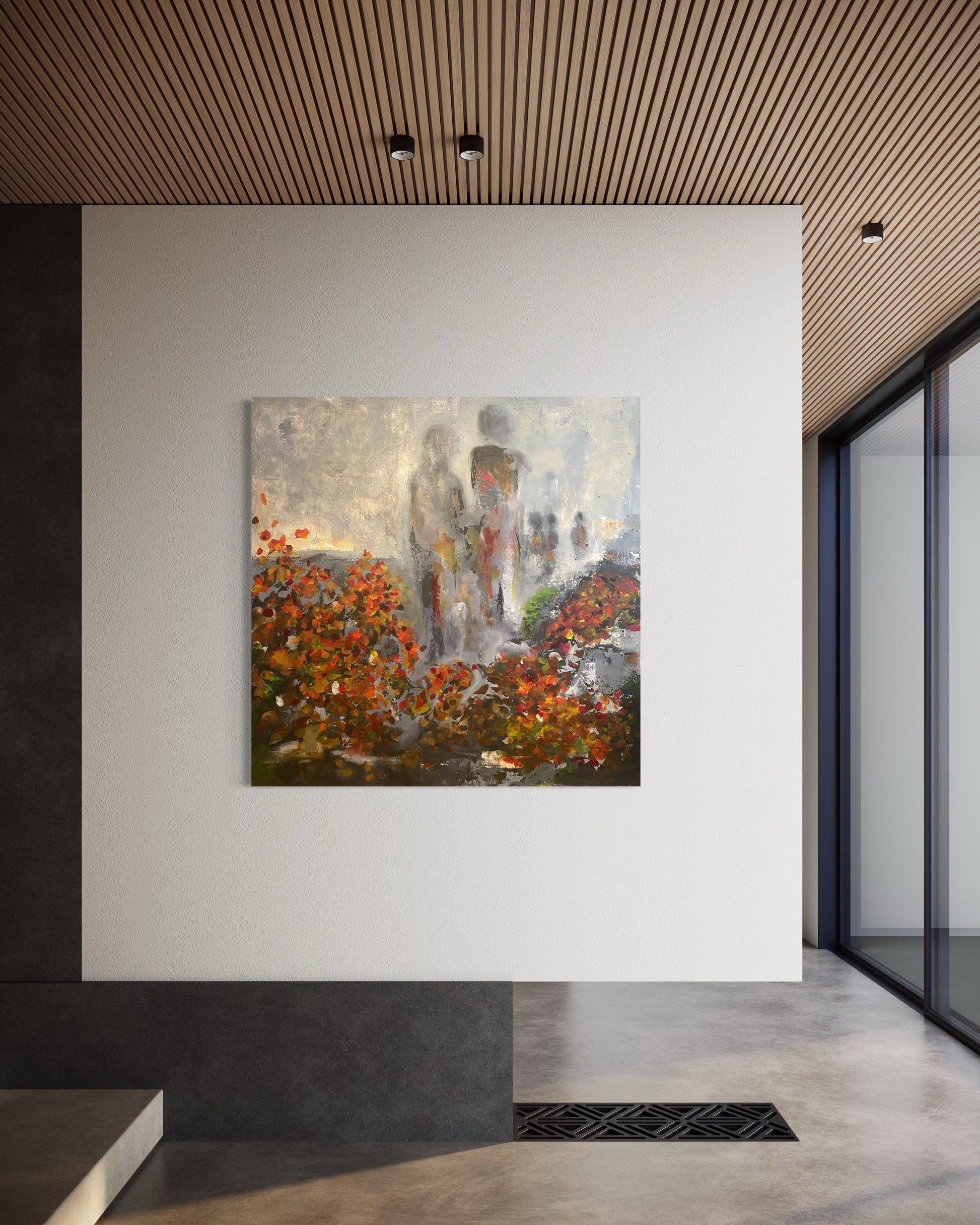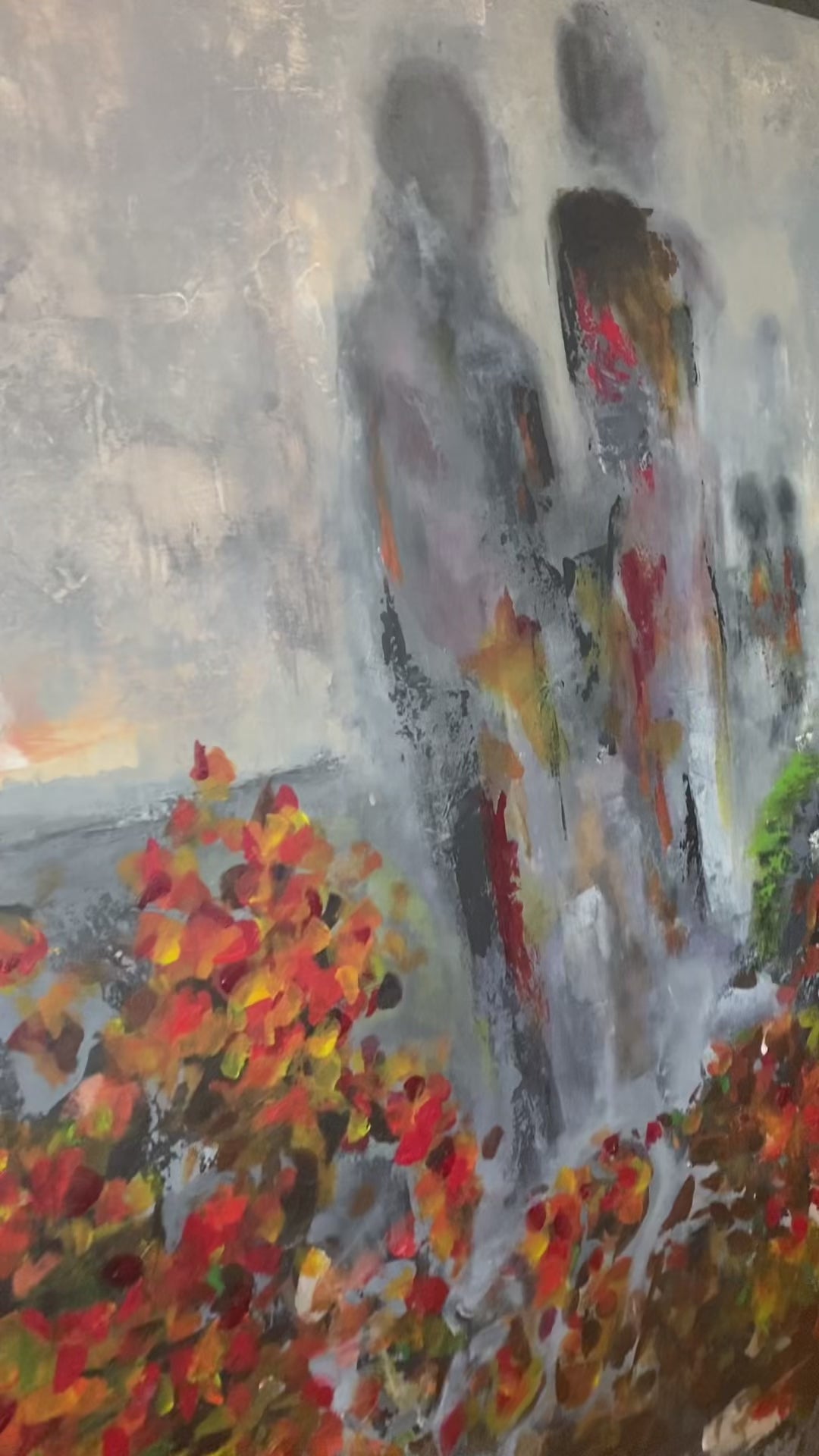 Transience explores the dynamic and ever changing nature of life. How all living things transition through different phases of life and states of existence. Ghostly silhouettes reminiscent of human forms lend an ephemeral quality to the work. The lower portion of the painting is anchored with colourful forms that resemble dense fall foliage with warm, vivid colours, soon to be followed by a period of dormancy, and then renewal.