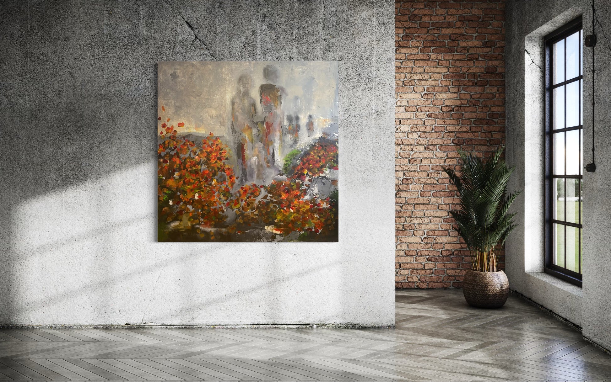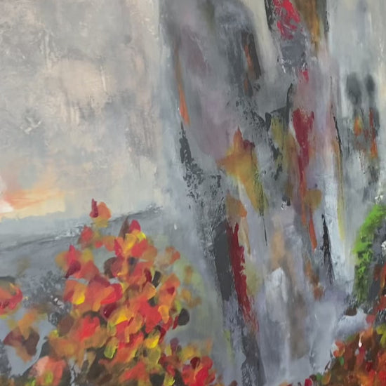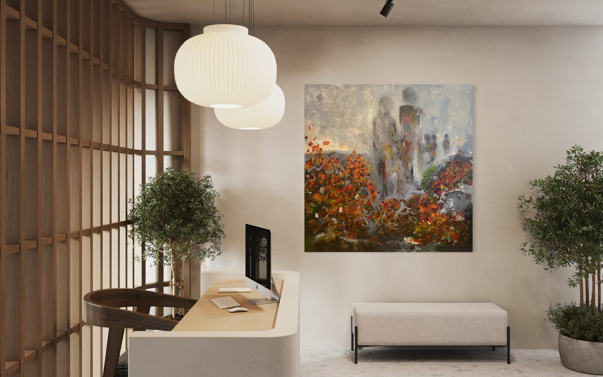Transience explores the dynamic and ever changing nature of life. How all living things transition through different phases of life and states of existence. Ghostly silhouettes reminiscent of human forms lend an ephemeral quality to the work. The lower portion of the painting is anchored with colourful forms that resemble dense fall foliage with warm, vivid colours, soon to be followed by a period of dormancy, and then renewal.