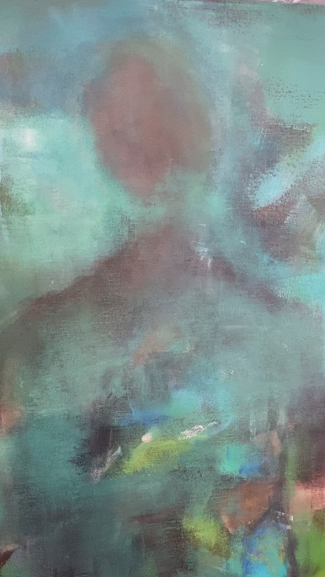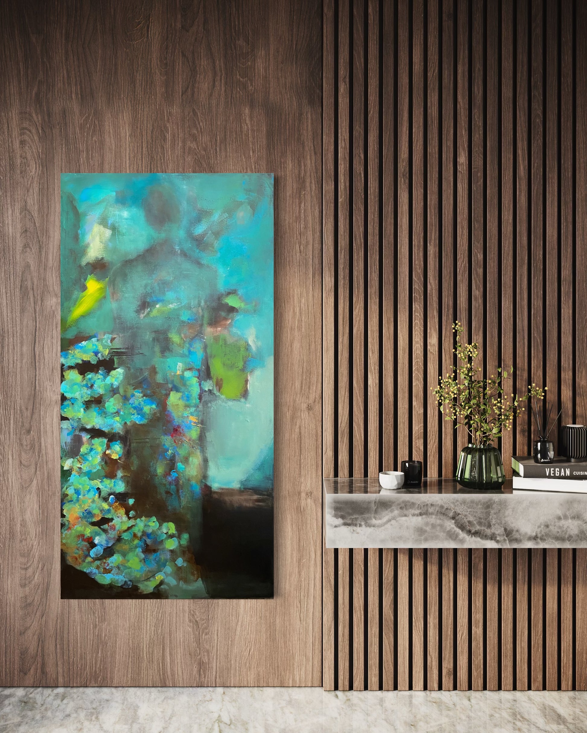 Areas of vibrant, textured brushstrokes appear in the foreground, reminiscent of colourful foliage and blooms. The vivid, organic clusters stand in juxtaposition to the fading figure, reminding the observer that, ultimately, life persists. The journey is solitary and introspective for the figure, but not a lonely one.