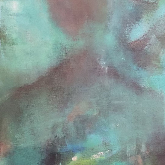 In Solitary Road, a faint silhouette of a human figure is walking along a path. The figure blends almost completely into the background and can only be distinguished from its surroundings through soft outlines and variations in the teal shading. This relationship between the faint silhouette and its environment evokes thoughts of a dissolution or a merging that represents a return to the wider collective of life, where the individual transitions from a state of finite separateness to one of a wider presence and connectedness.