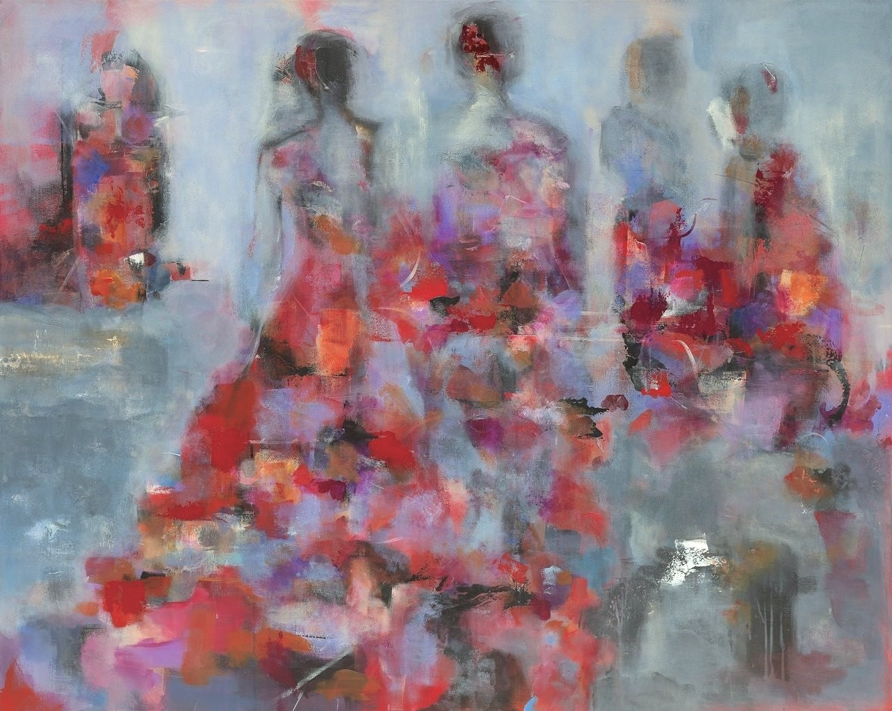 Farewell captures the human experience of letting something go and cherishing its memory. Two loosely delineated figures standing upright watch as two shrinking human forms growing more distant begin to fade into a misty grey background. The fading silhouettes appear almost caught mid-transition, on the verge of departing.