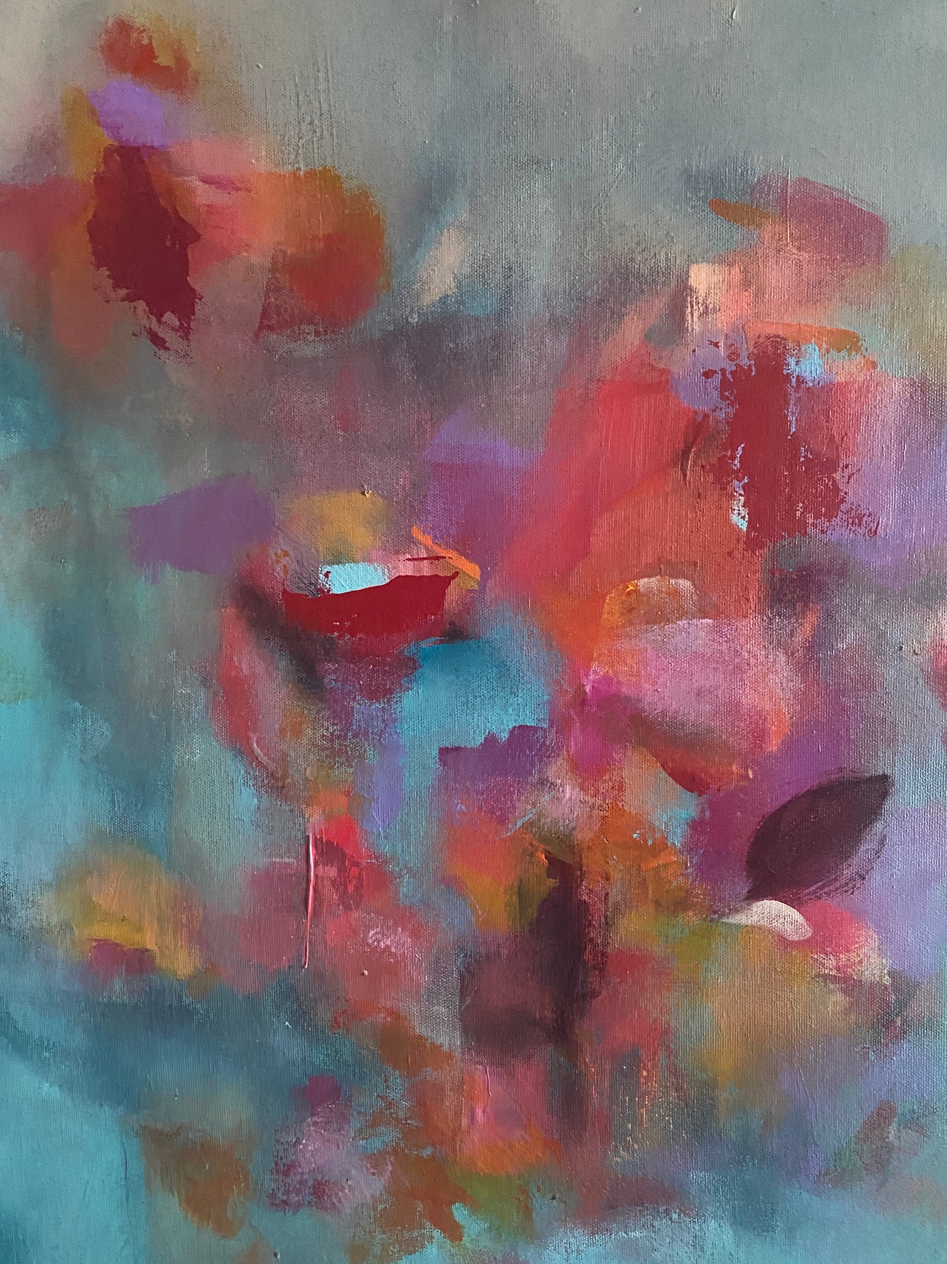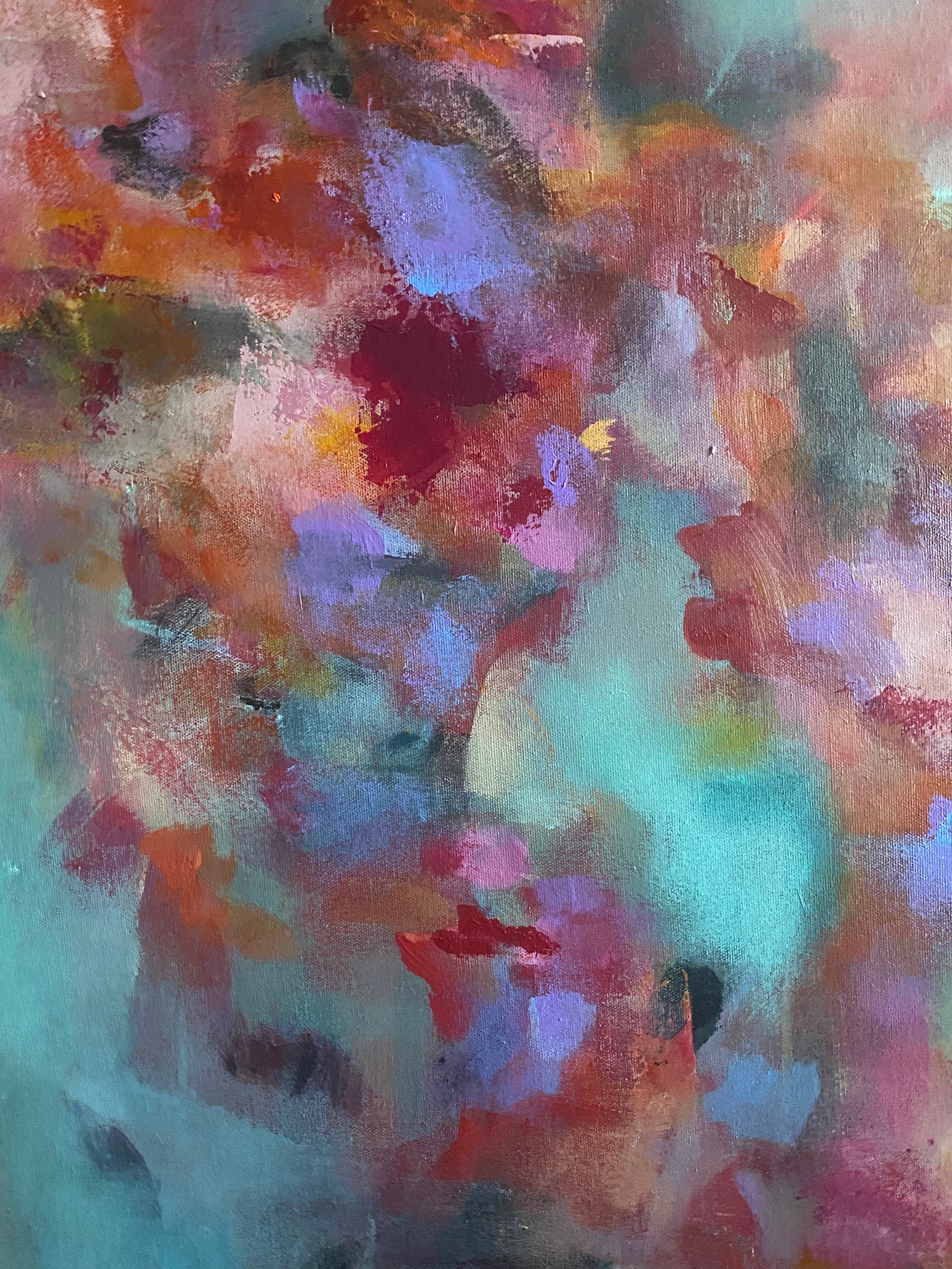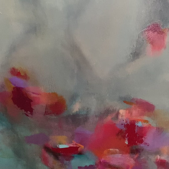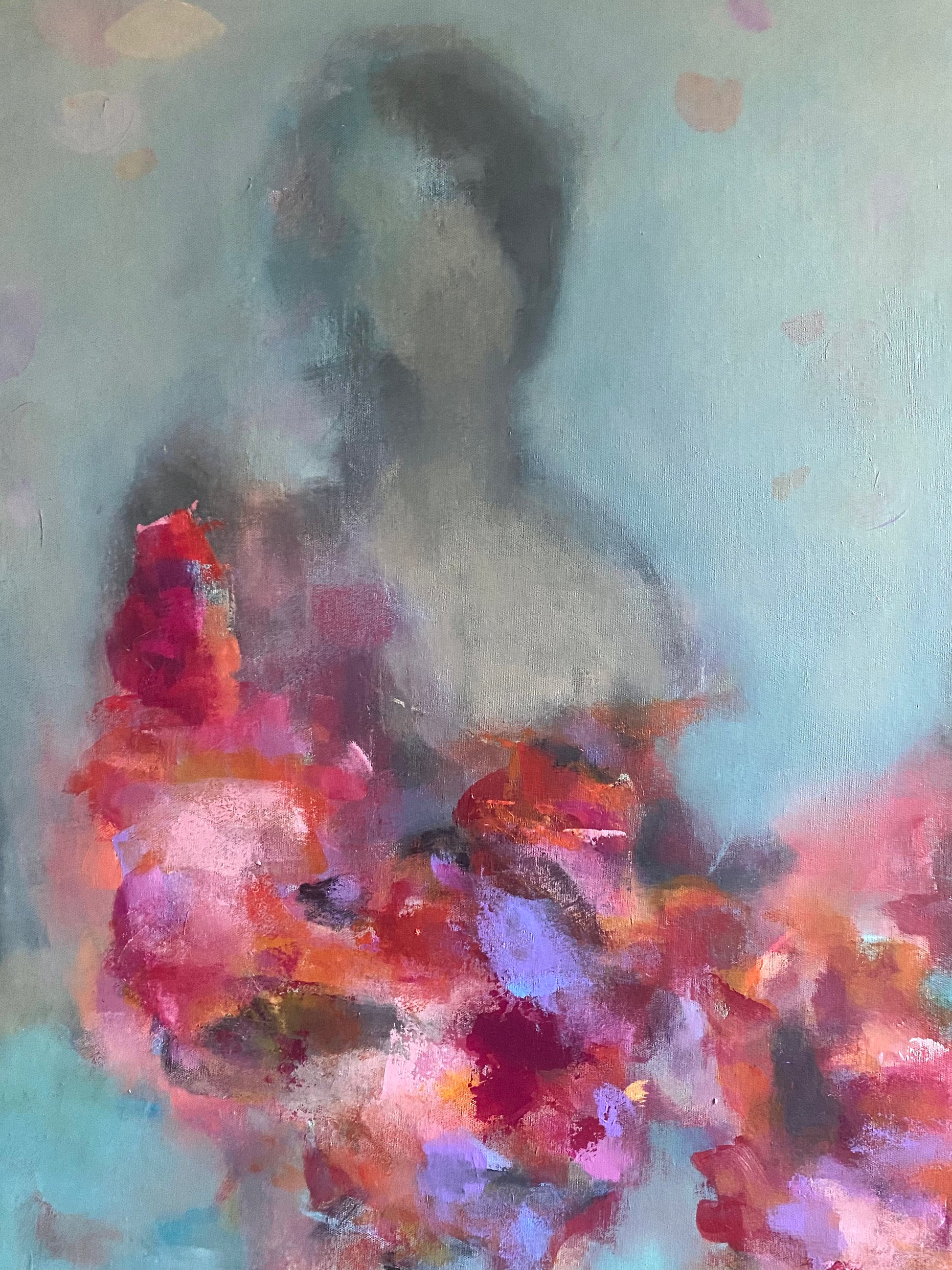 Rhapsody depicts four human figures that appear as faint silhouettes symbolizing the spirit or the essence of self. In the foreground, bright painted shapes reminiscent of flowers burst with vivid colours representing joy, emotional energy, and connection. The brushwork is layered with patches of colour that blend, dissolve, and reappear, adding movement and depth to the artwork.
