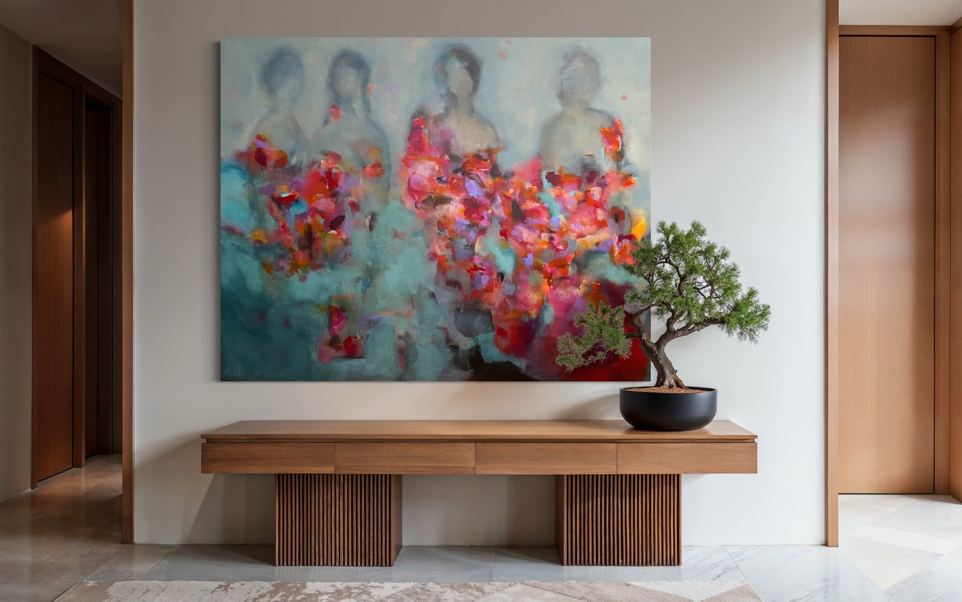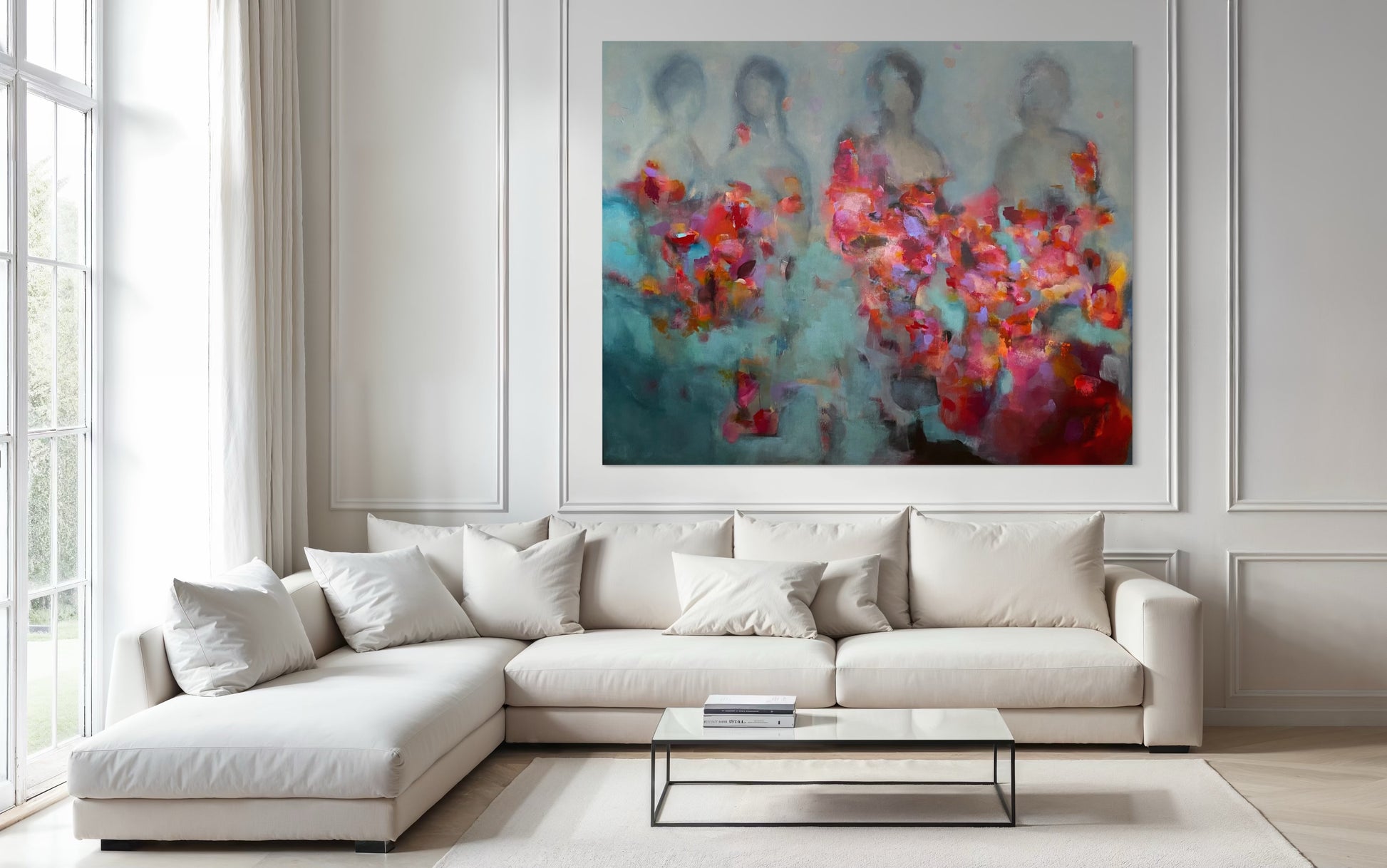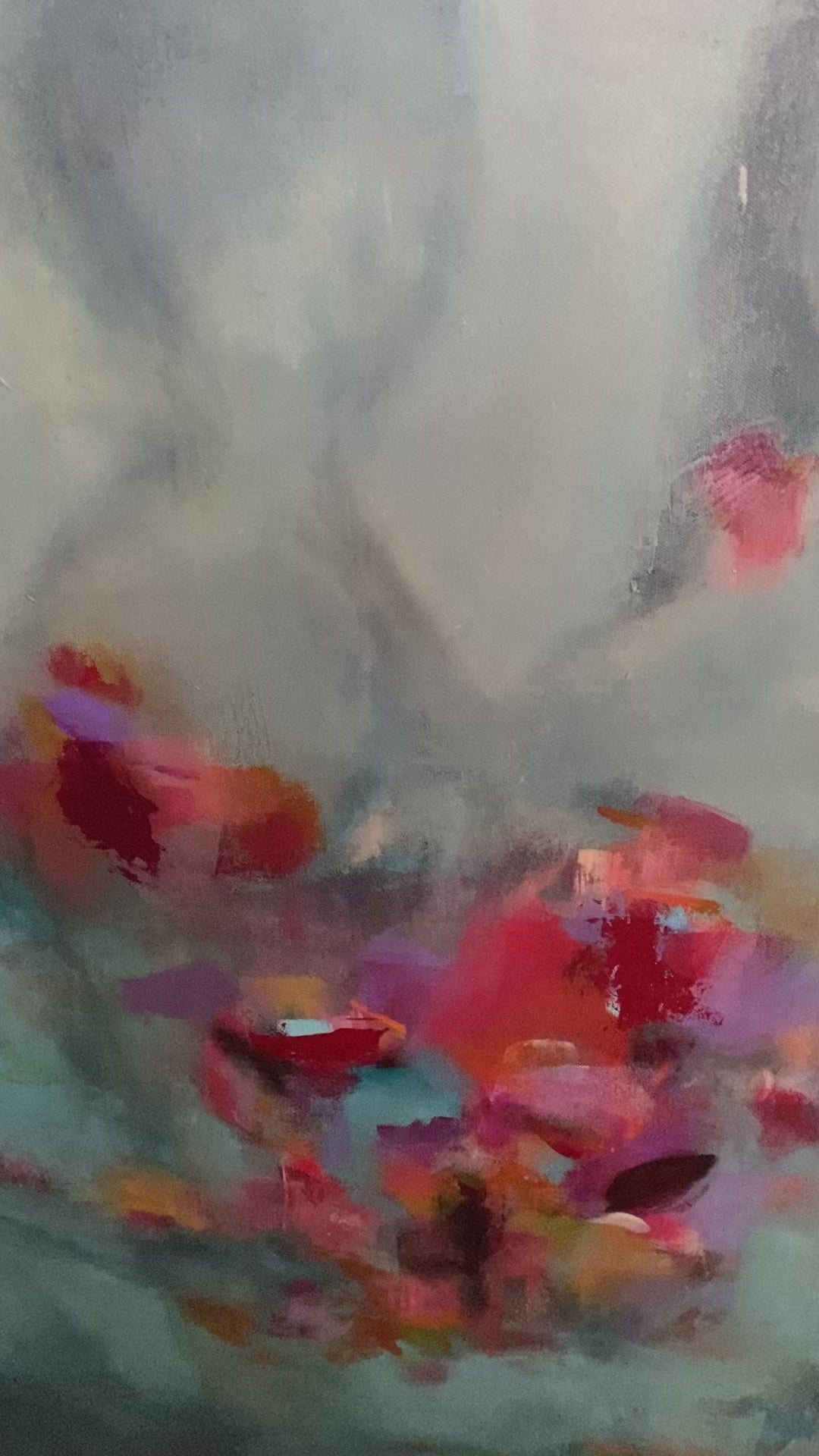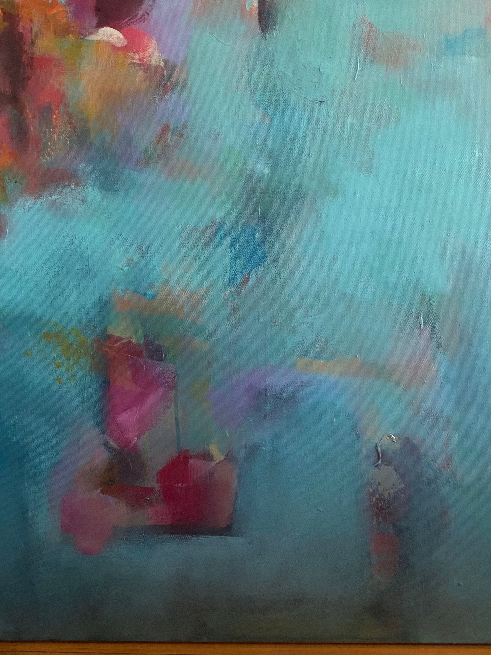 Rhapsody depicts four human figures that appear as faint silhouettes symbolizing the spirit or the essence of self. In the foreground, bright painted shapes reminiscent of flowers burst with vivid colours representing joy, emotional energy, and connection. The brushwork is layered with patches of colour that blend, dissolve, and reappear, adding movement and depth to the artwork.